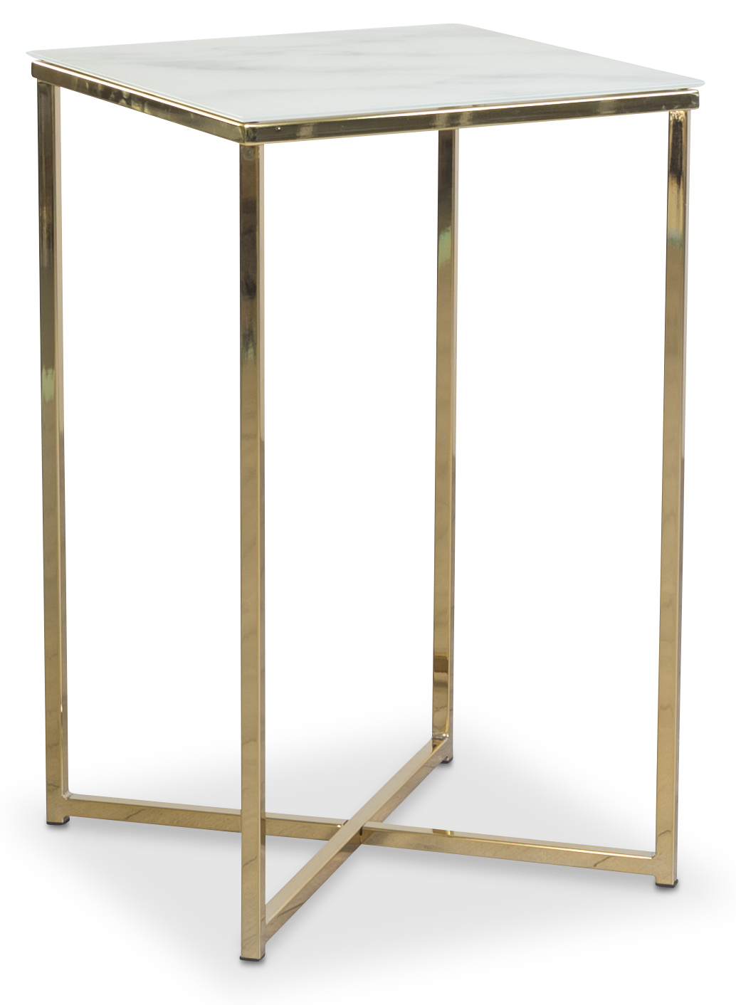 Et lettplassert lite lampebord som er inspirert av Art deco-stilen. Frostet glassplate med lys marmorering og understell i blank messing.