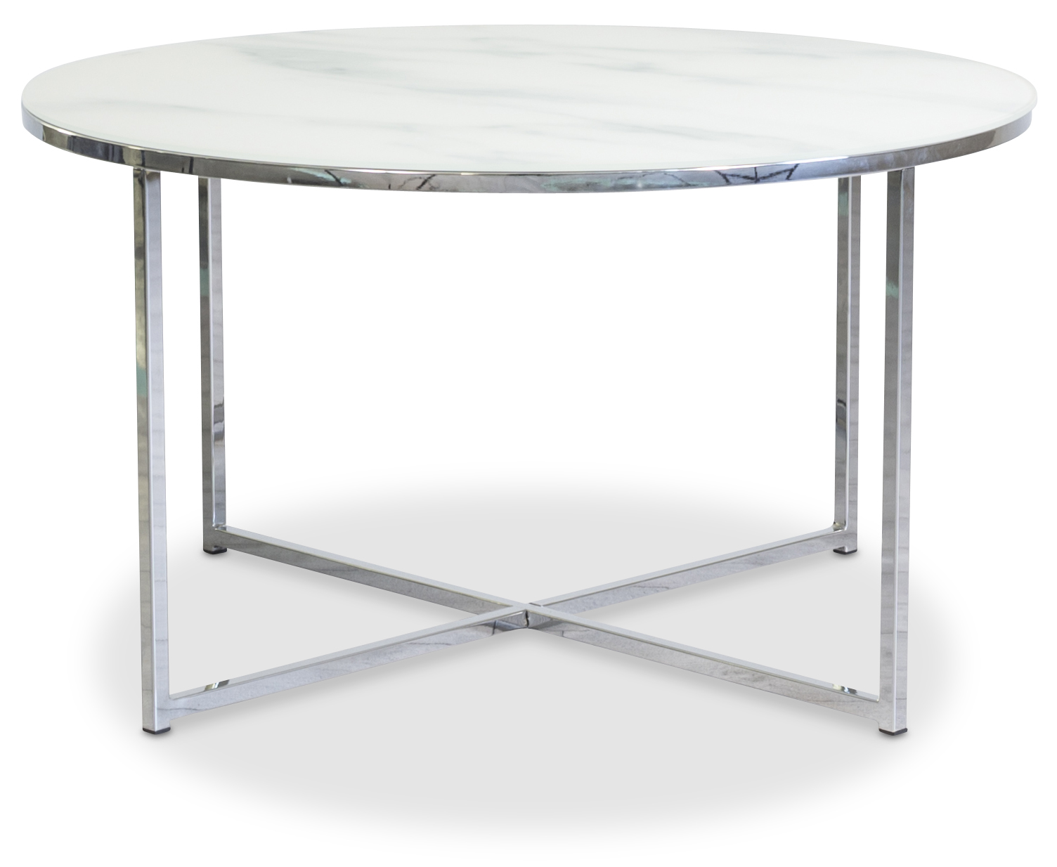 Et lettplassert rundt sofabord som er inspirert av Art deco-stilen. Frostet glasskive med lys marmorering og et understell i krommet metall.