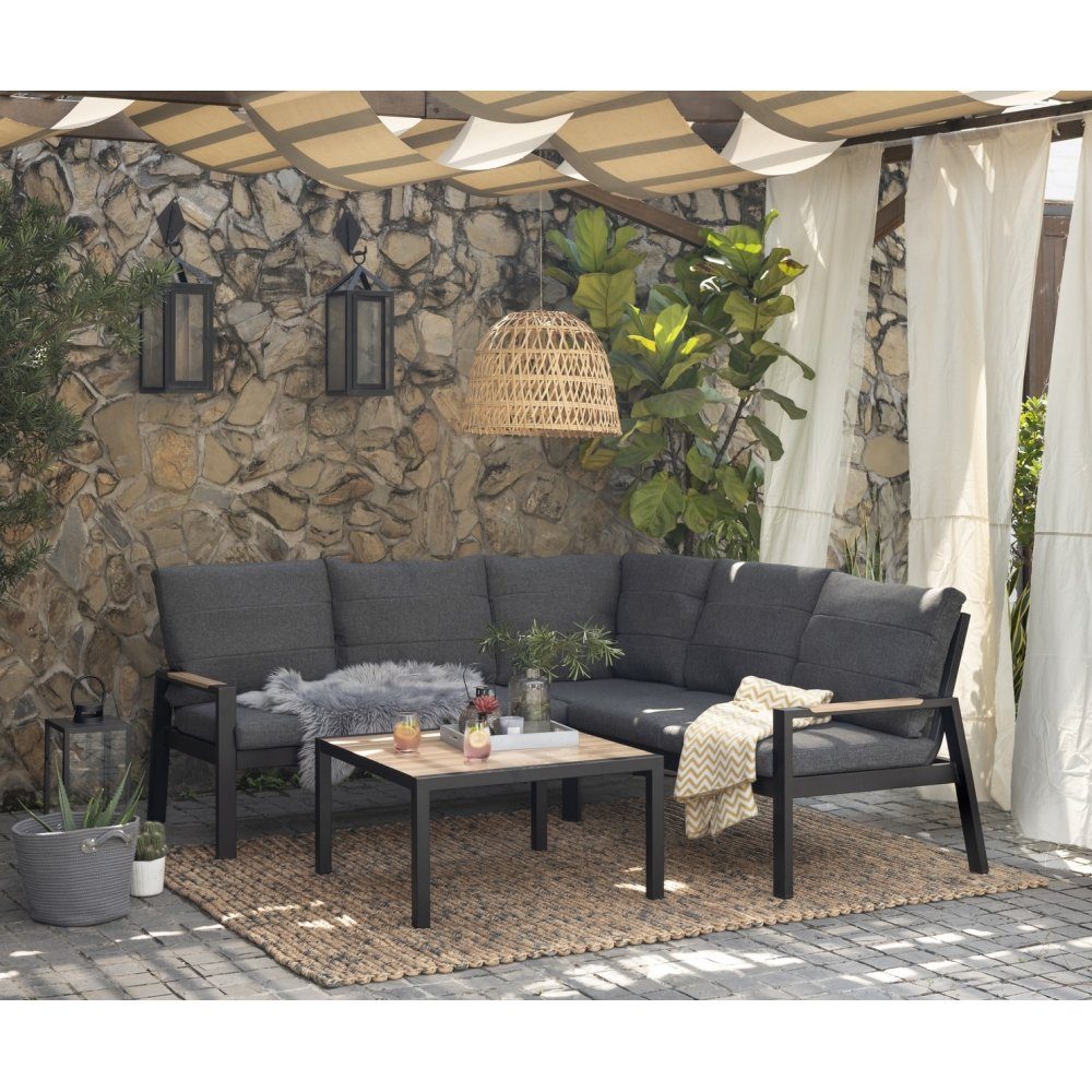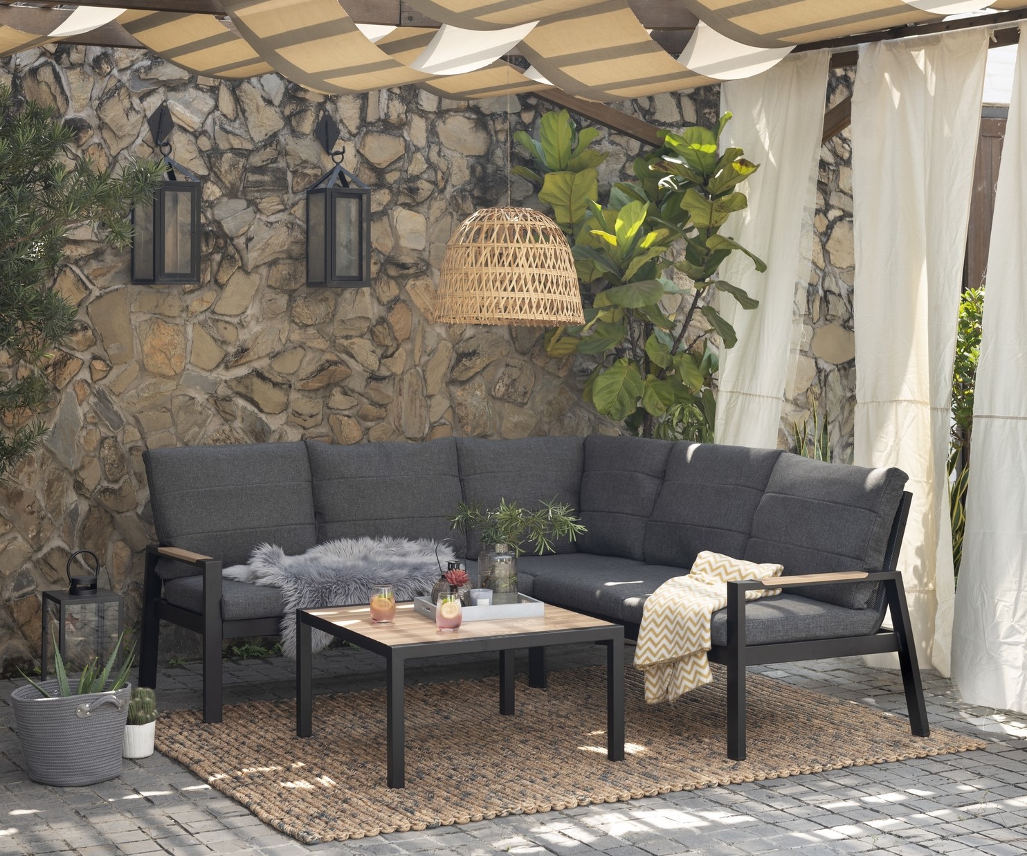 Loungegruppe med 1 hjørnesofa og 1 salongbord. Laget av rustfritt aluminium med olefinputer.