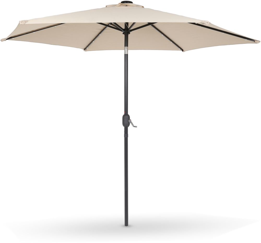 Fleksibel og lett håndterbar parasoll med innebygd LED-belysning drevet av solcelle øverst i parasollen. Lett å felle ut og sammen med sveiven midt på stolpen. Stolpen er laget av pulverlakkert stål og solskjermen er av polyester.