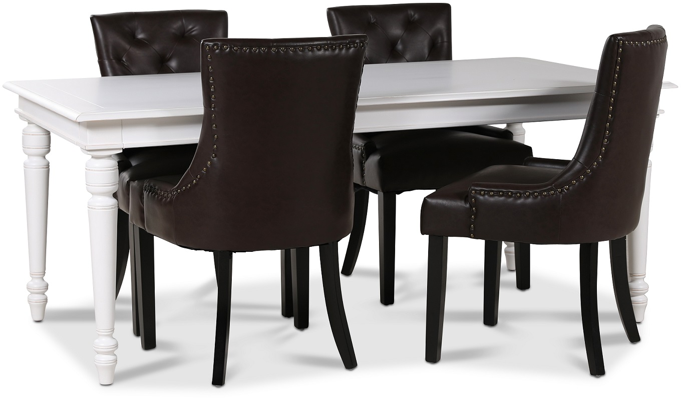 Spisegruppe fra Skånska Möbelhuset, Paris er et klassisk spisebord i hvitlakkert heltre med gjennomarbeidede og gjennomarbeidede detaljer. Fire moderne og matchende Tuva Eastport-stoler i brun PU og brune ben.