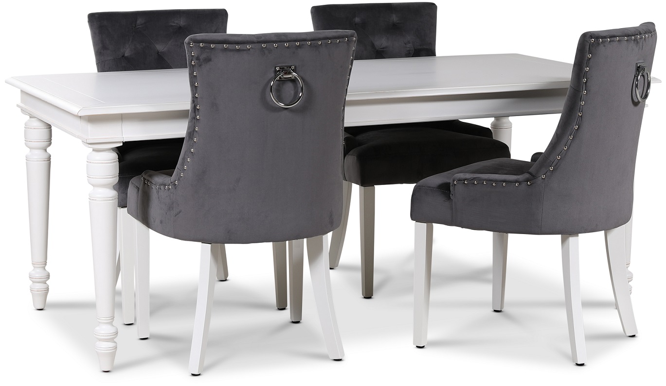 Spisegruppe fra Skånska Möbelhuset, Paris er et klassisk spisebord i hvitlakkert heltre med gjennomarbeidede og gjennomarbeidede detaljer. Fire moderne og matchende Tuva-stoler i grått fløyelsstoff, kromnagler, rygghåndtak og hvite ben.
