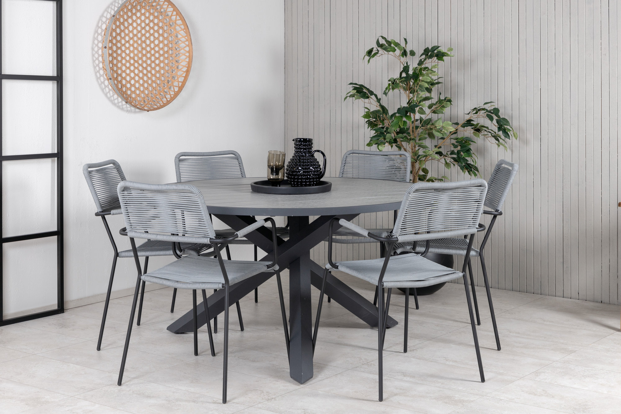 Skap en innbydende spisestue med det runde Parma spisebordet og de komfortable Lindos spisestolene i grått tau. Et rundt spisesett gjør det enkelt å sosialisere seg og passer perfekt på terrassen eller uterommet.