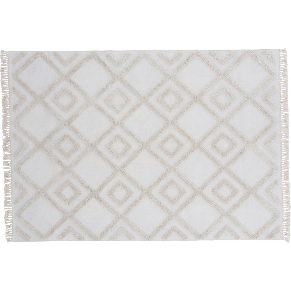 Håndvevd polyesterteppe i dekorativt design med fargebase i hvitt. Teppet har et hevet mønster i beige fargetone og dekorative frynser.