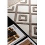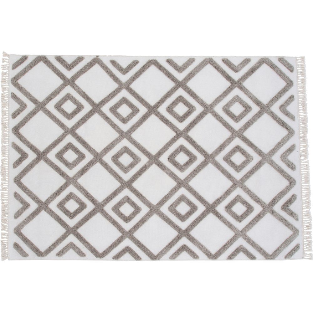 Håndvevd polyesterteppe i dekorativt design med fargebase i hvitt. Teppet har et hevet mønster i nougat fargetone og dekorative frynser.