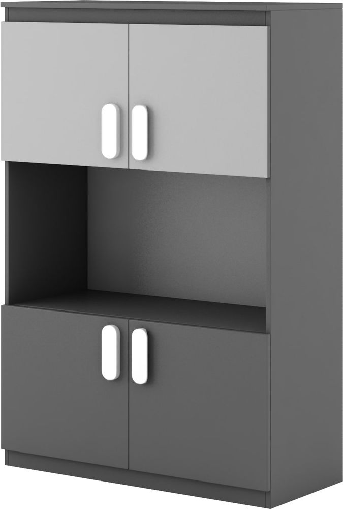 Et fint oppbevaringsskap med moderne design. Produsert i MDF med gode oppbevaringsmuligheter i form av fire skap og et åpent hylleplan.