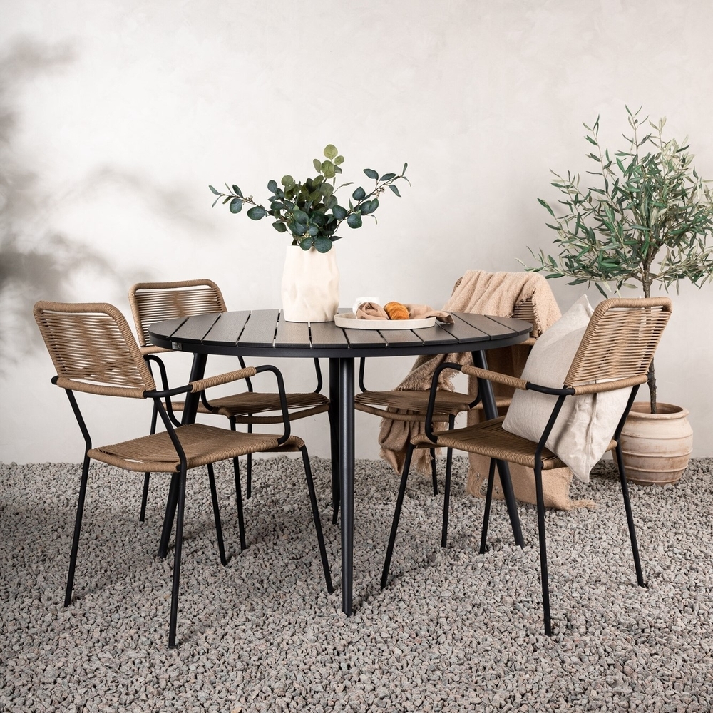 Skap et blikkfang i vinterhagen eller på balkongen som imponerer. Denne trendy spisegruppen har et gjennomtenkt helhetsdesign med stoler fra Lindos-serien i jordfarger og et sort spisebord fra Break-serien. Stolene har integrerte armlener i sort aluminium og sete i slitesterkt lattefarget tau. Bordet har en rund bordplate i Aintwood og lett utsvingte aluminiumsben. Her har alle en plass og ingen risikerer å havne på kanten!