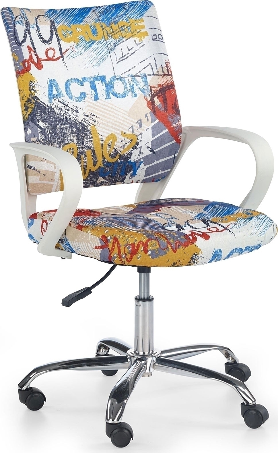 En koselig kontorstol med stilig design. Laget i metall med detaljer i plast og et meget behagelig trekk i hvitt kunstskinn & stoff med trykk. Setet kan heves og senkes og er lett å flytte ved hjelp av hjulene under stjernefoten.