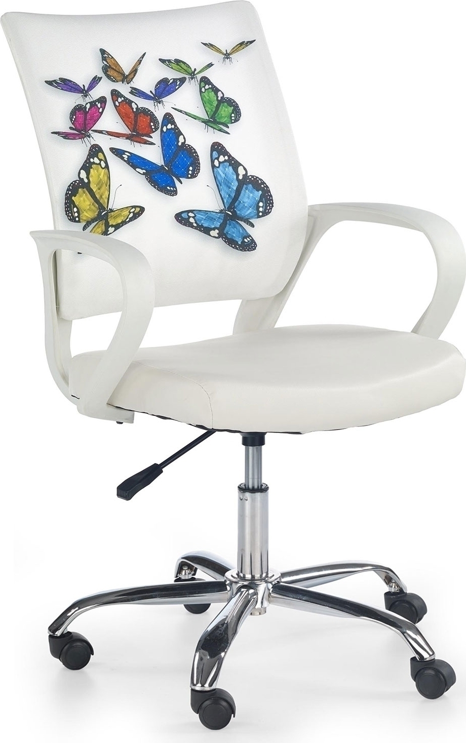 En koselig kontorstol med et stilrent design. Produsert i metall med detaljer i plast og et meget behagelig trekk i hvitt kunstlær & stoff med trykk. Setet er hev- og senkbart, samt enkel å flytte ved hjelp av hjulene under stjernefoten.