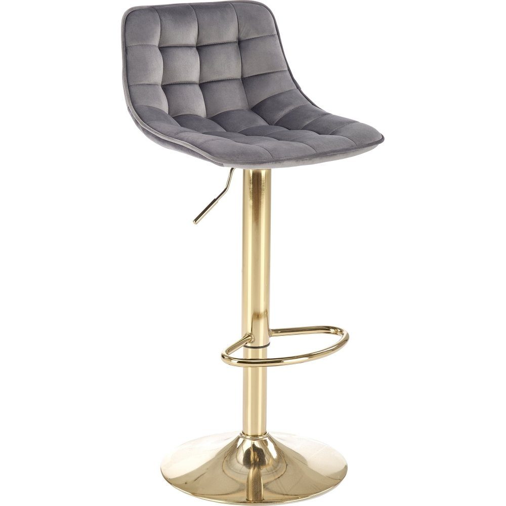 Barkrakk med trekk i stilig grått fløyelsstoff. Base laget av gyllent metall. Barkrakken er høydejusterbar og kan justere setehøyden fra 62 cm til 84 cm.