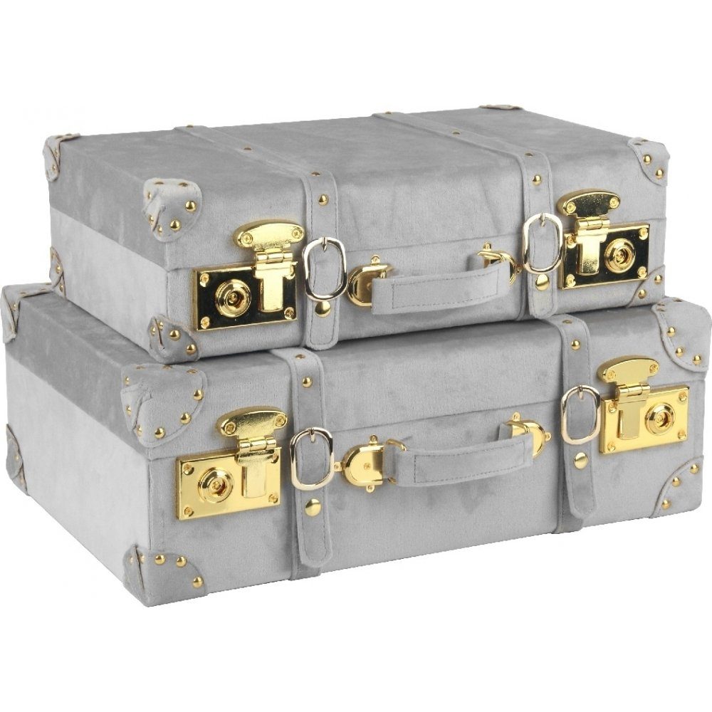 Petit koffert sett består av to kofferter i stilig grå myk fløyel med frekke messingdetaljer. Perfekt som oppbevaring, bruk som nattbord, sidebord eller som en stilig interiørdetalj.