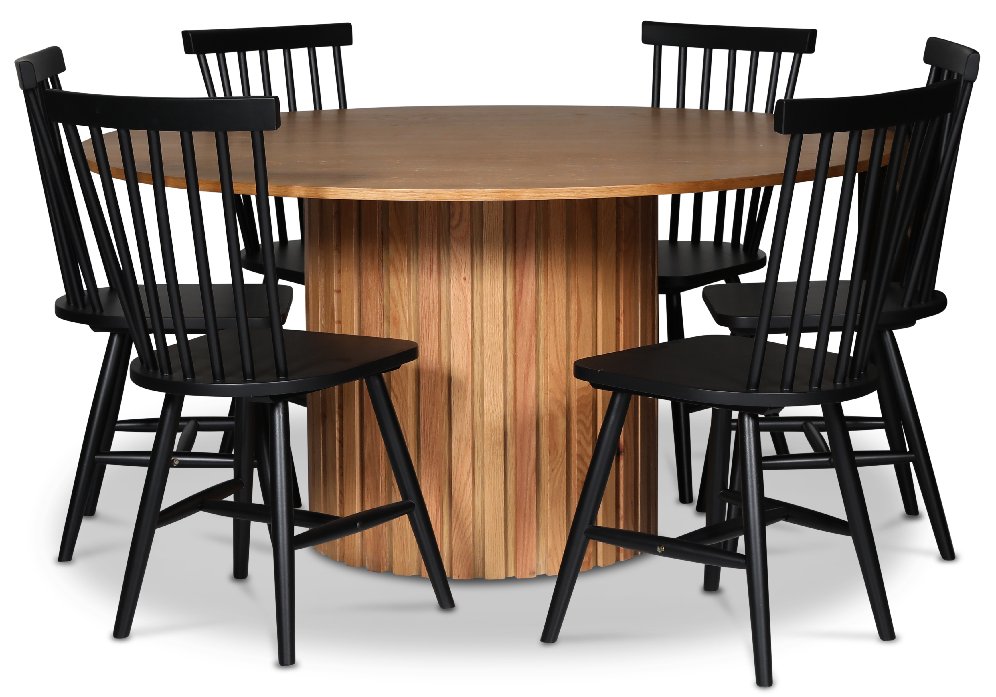 PiPi spisegruppe; Ø150 cm rundt spisebord i oljet eik + 6 svarte pinnestoler