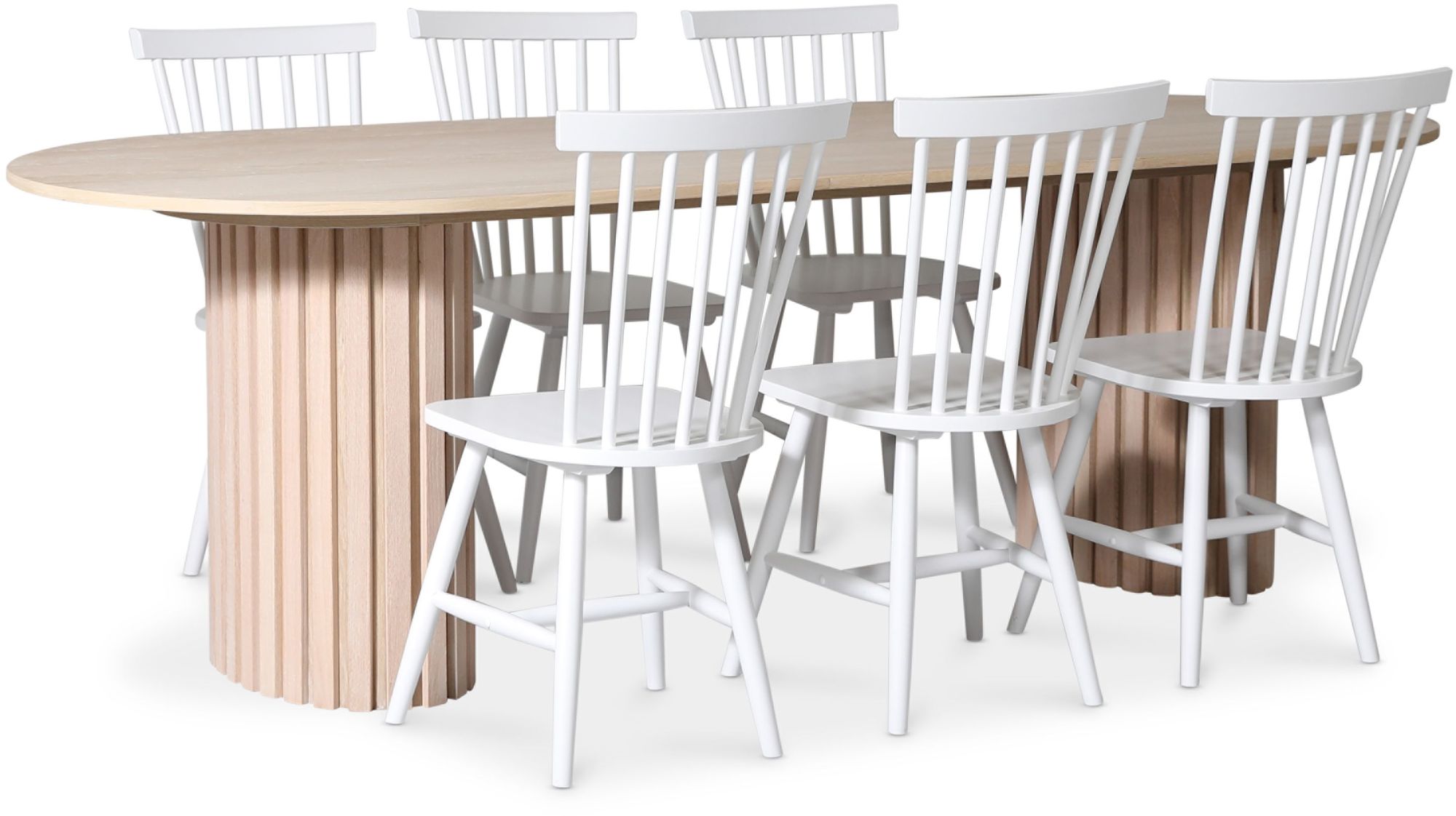 PiPi spisegruppe 240 cm inkl. 6 stk. Karl hvite pinnestoler - Whitewash + Møbelføtter