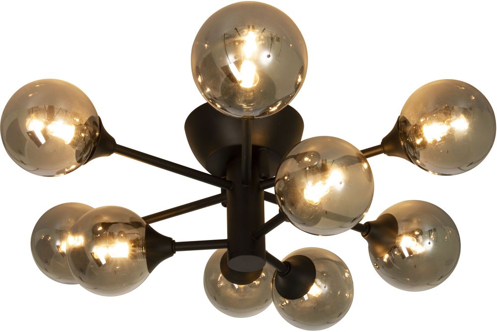 Taklampe i svart metall og røykgrått glass. Henges enkelt opp i taket.