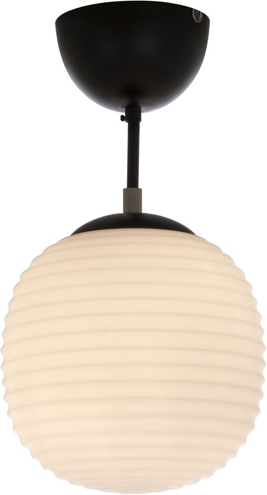 Taklampe i svart metall og opalhvitt glass. Henges enkelt opp i taket.