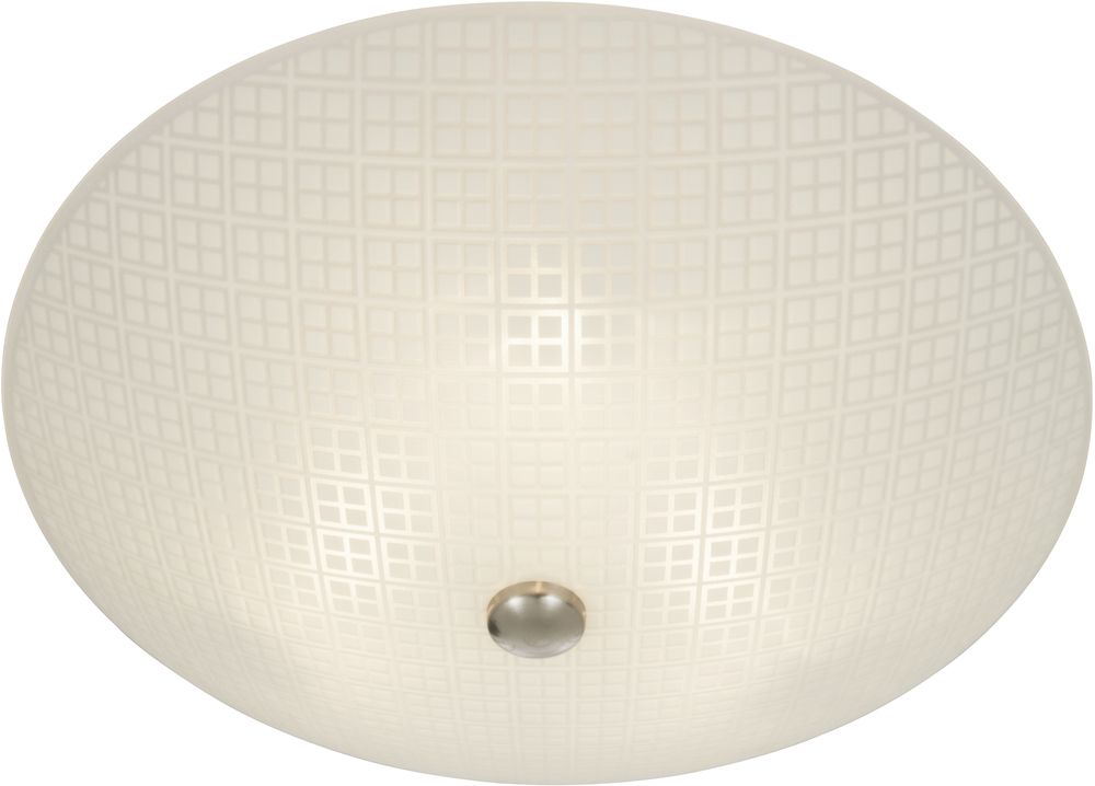 Taklampe i metall og hvitt glass med mønster. Monteres enkelt i taket.