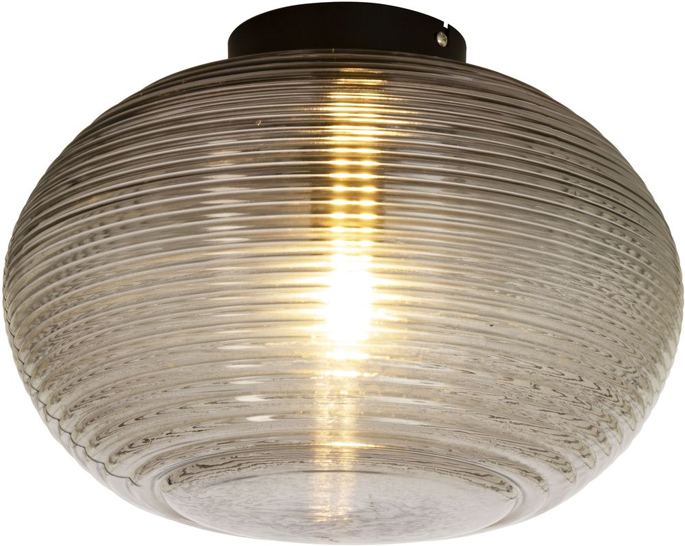 Taklampe i svart metall og røykgrått glass. Henges enkelt opp i taket.