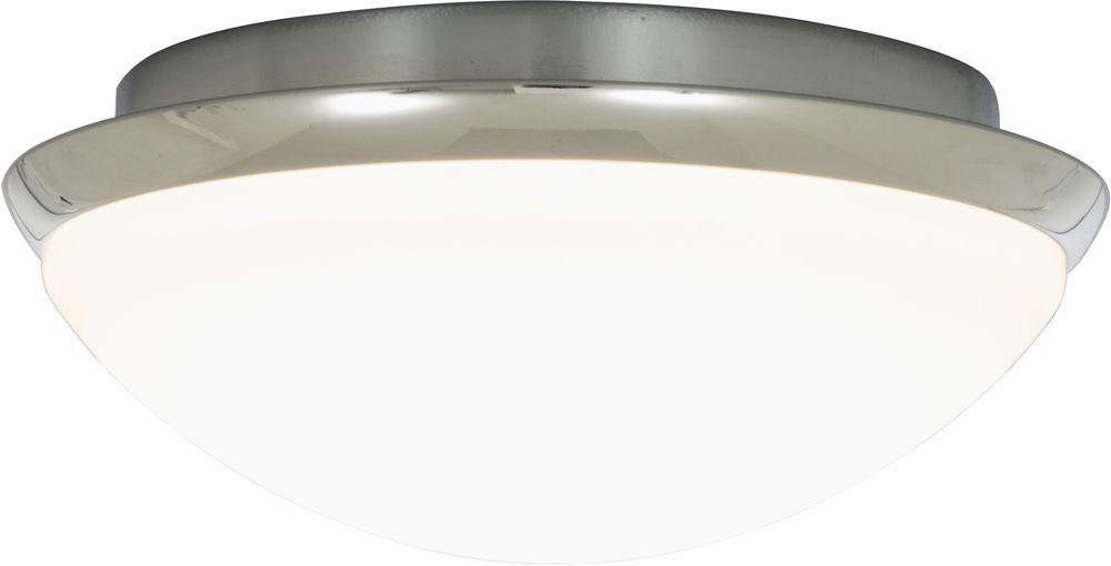 Baderomslampe i forkrommet metall og hvitt glass.