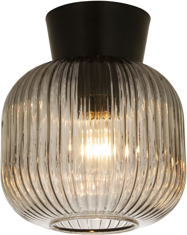 Taklampe i svart metall og røykgrått glass. Enkel montering i taket.