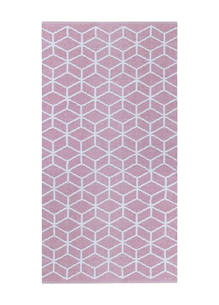 Britton plastmatte har et rosa-hvitt mønster med sveisede kanter på endene. Teppet har inverterte farger der fargene blir omvendt om man snur på den.