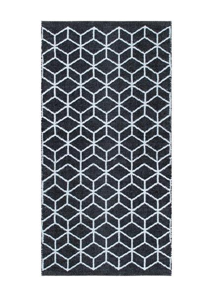 Britton plastmatte har et svart-hvitt mønster med sveisede kanter på endene. Matten har inverterte farger der fargene blir omvendte når man snur den.