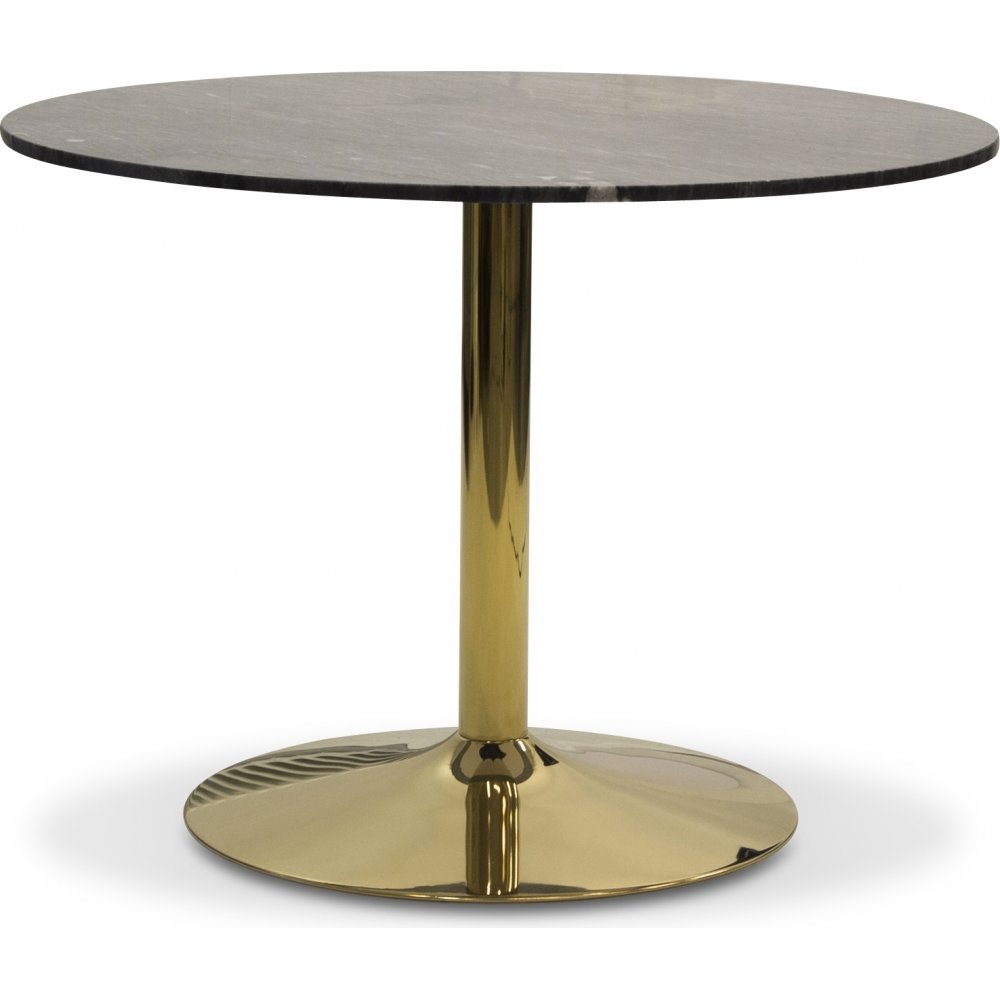 Et rundt spisebord i stilren og moderne design med topplate i ekte grå marmorstein. Trompetfot i blank messing.