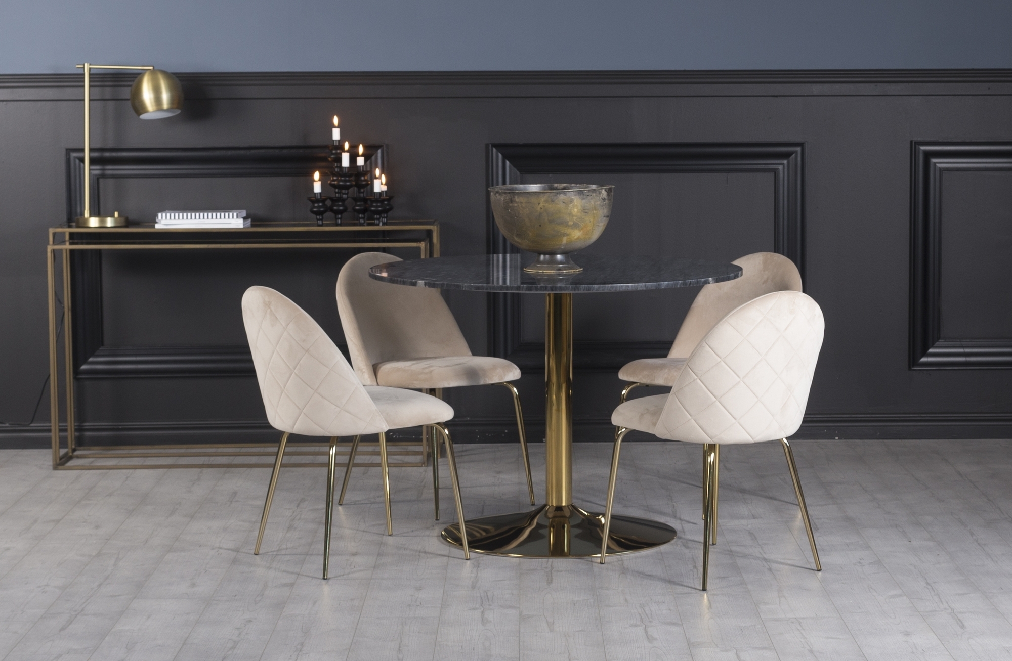 Plaza spisegruppe, marmorbord med 4 st Plaza fløyelstoler - Beige/Grå/Messing