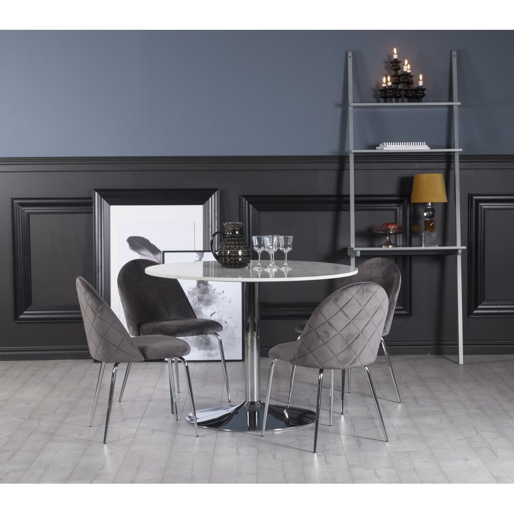 Plaza spisegruppe, marmorbord med 4 st Plaza fløyelstoler - Grå/Hvit/Krom: