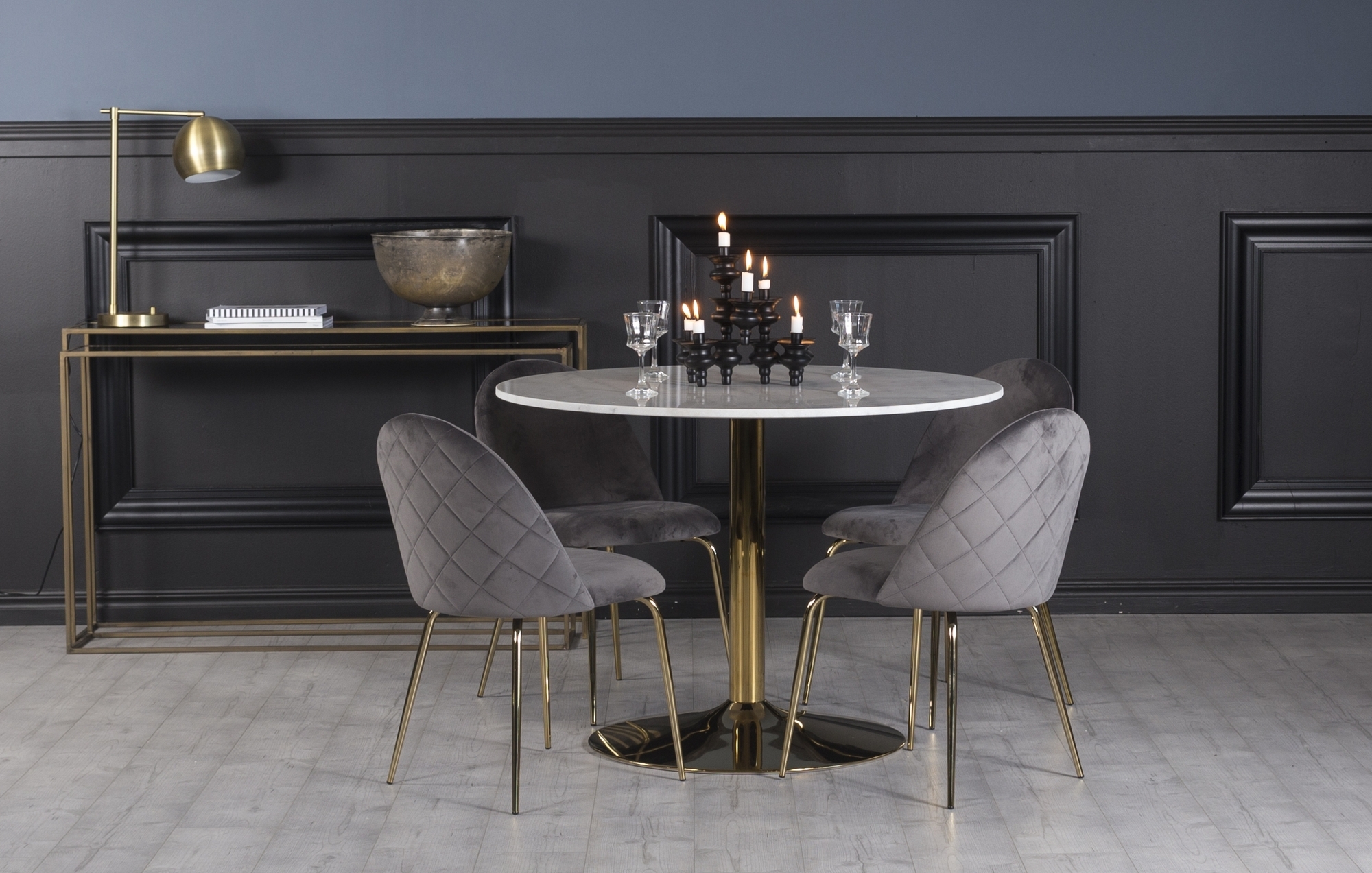 Plaza spisegruppe, marmorbord med 4 st Plaza fløyelstoler - Grå/Hvit/Messing