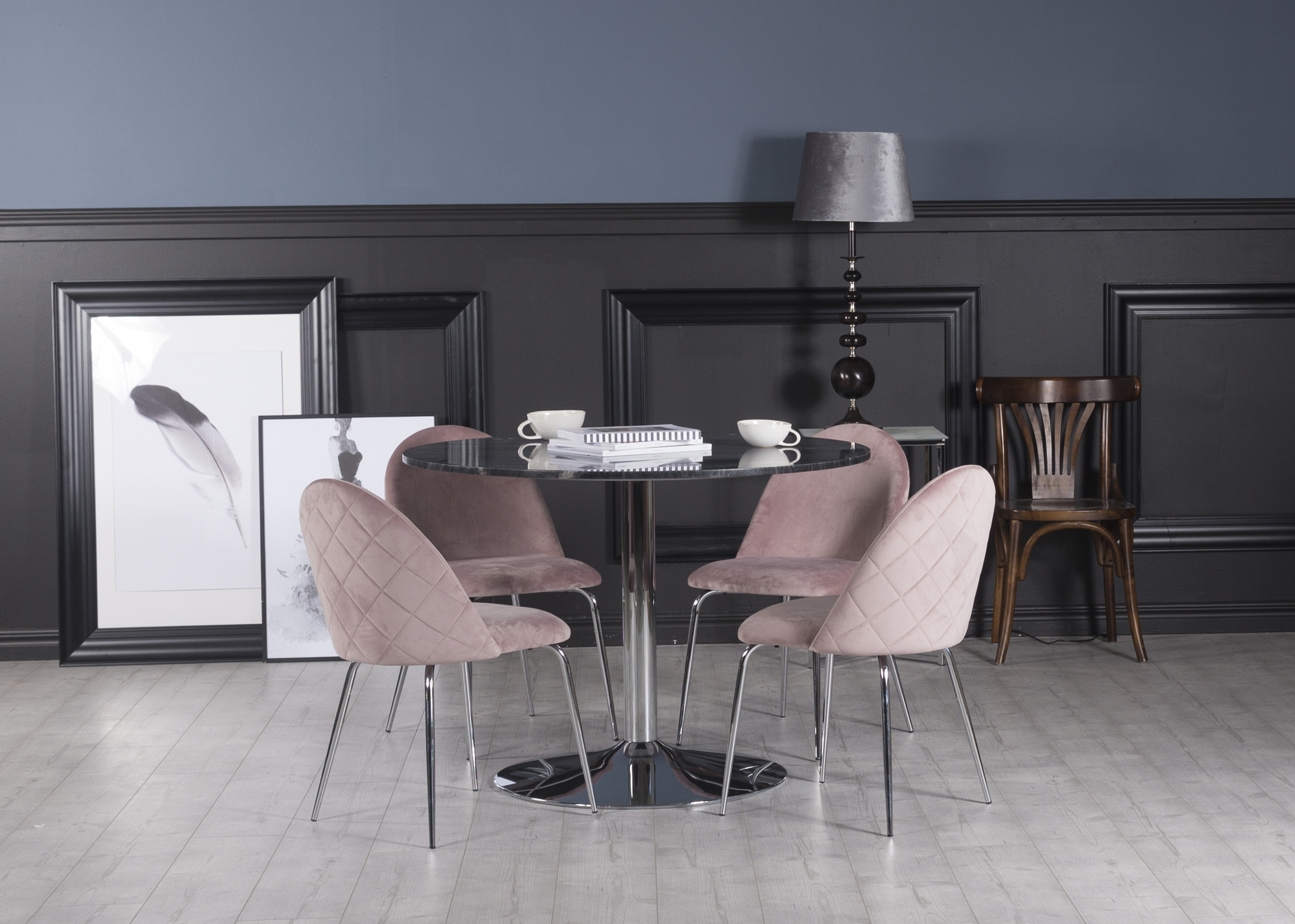 Plaza spisegruppe, marmorbord med 4 st Plaza fløyelstoler - Rosa/Grå/Krom