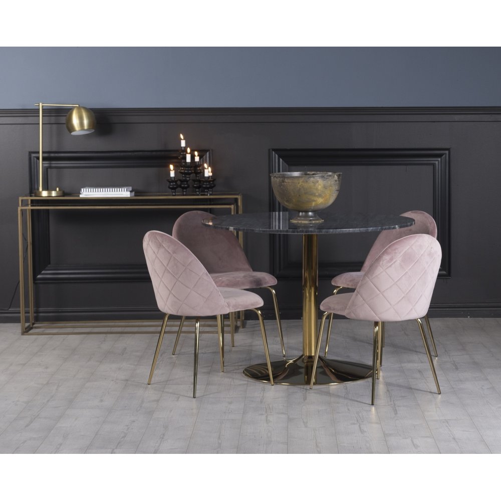 Plaza spisegruppe, marmorbord med 4 st Plaza fløyelstoler - Rosa/Grå/Messing