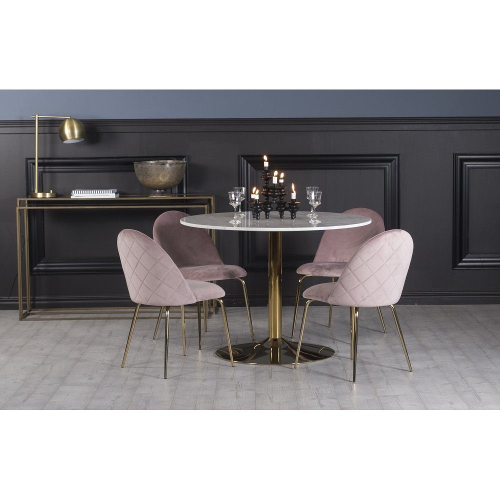 Plaza spisegruppe, marmorbord med 4 st Plaza fløyelstoler - Rosa/Hvit/Messing