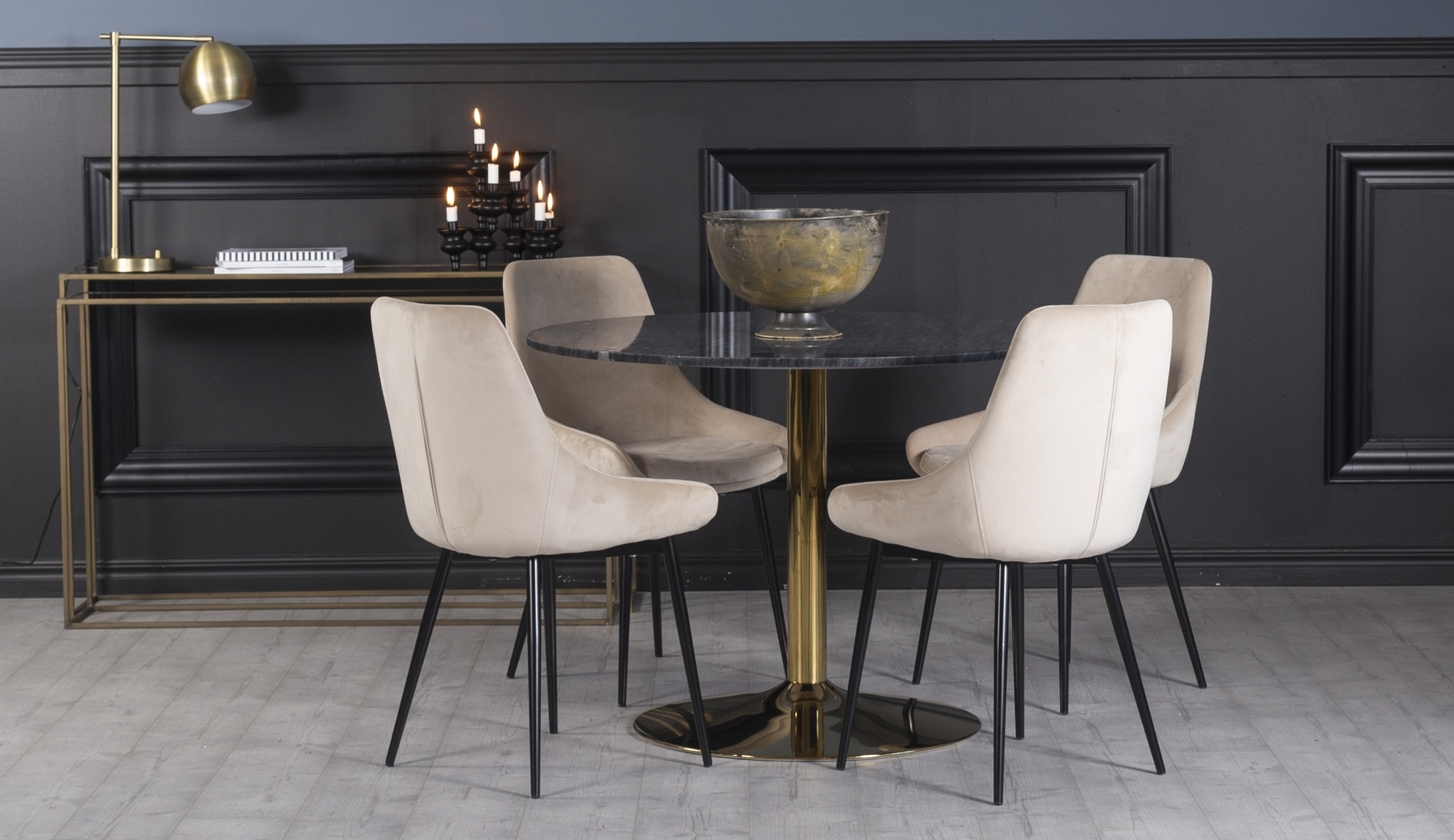 Plaza spisegruppe, marmorbord med 4 st Theo fløyelstoler - Beige/Grå/Messing