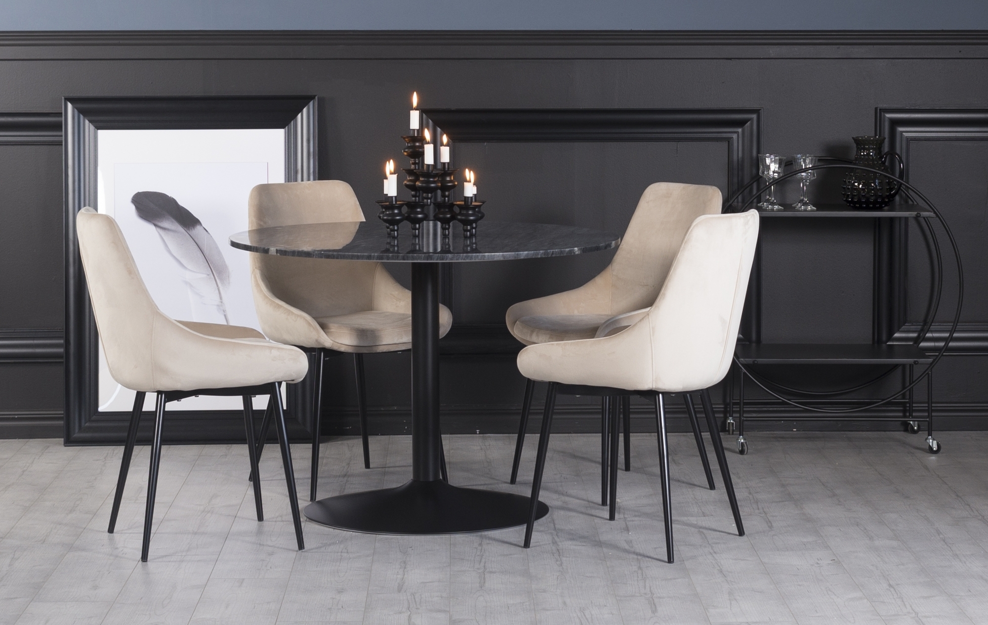 Plaza spisegruppe, marmorbord med 4 st Theo fløyelstoler - Beige/Grå/Svart