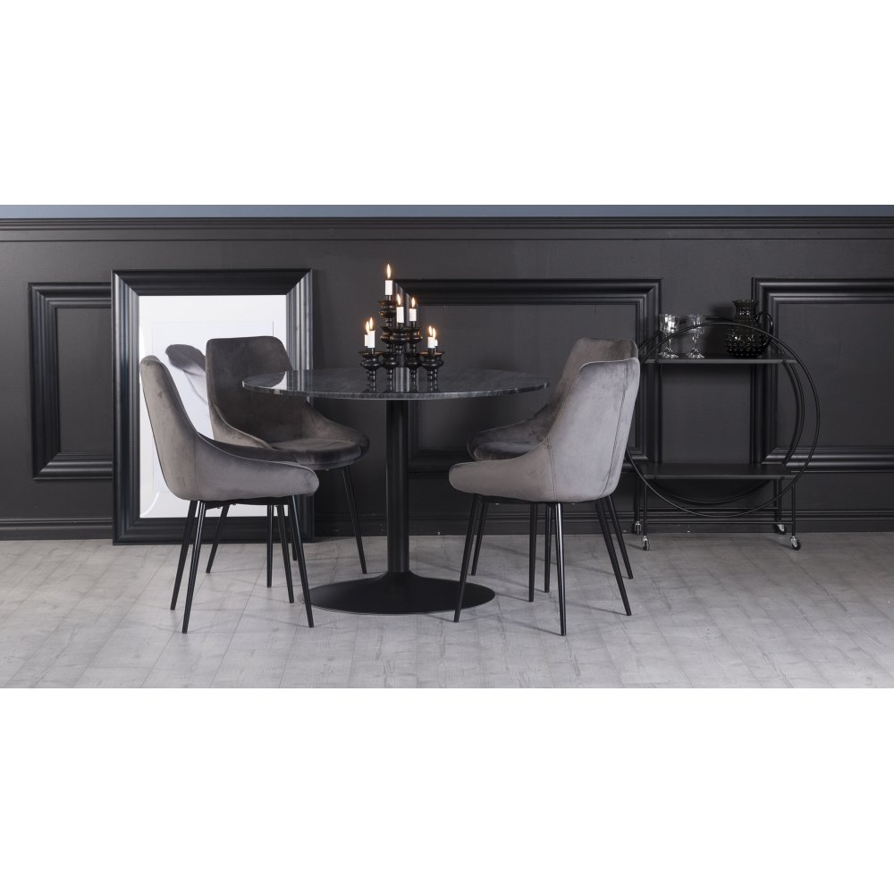 Plaza spisegruppe, marmorbord med 4 st Theo fløyelstoler - Grå/Svart