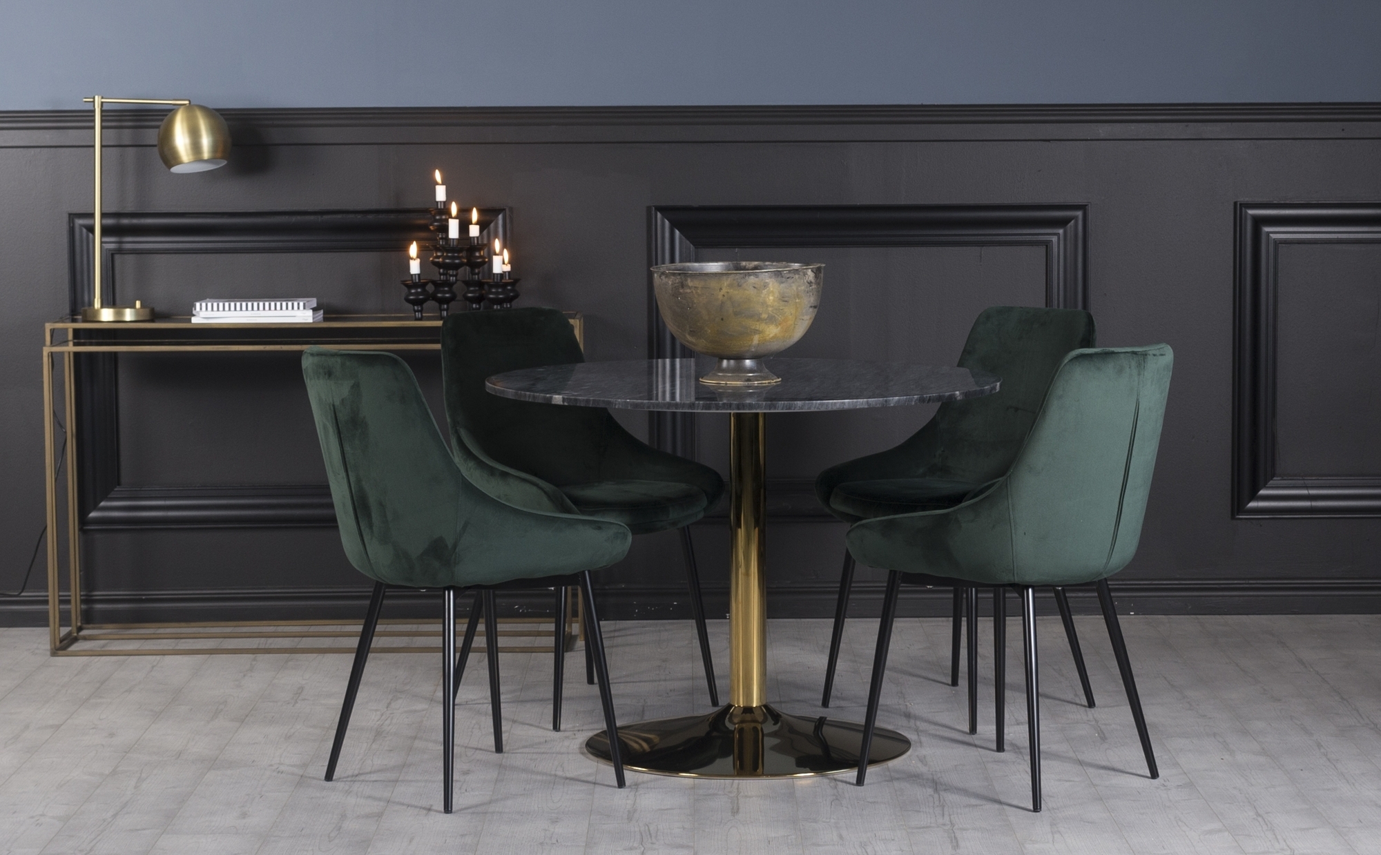 Plaza spisegruppe, marmorbord med 4 st Theo fløyelstoler - Grønn/Grå/Messing