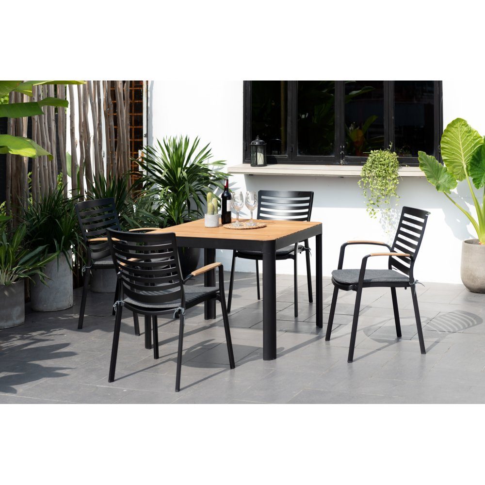Spisegruppe med 1 kvadratisk spisebord (95x95 cm) og 4 stablebare spisestoler.