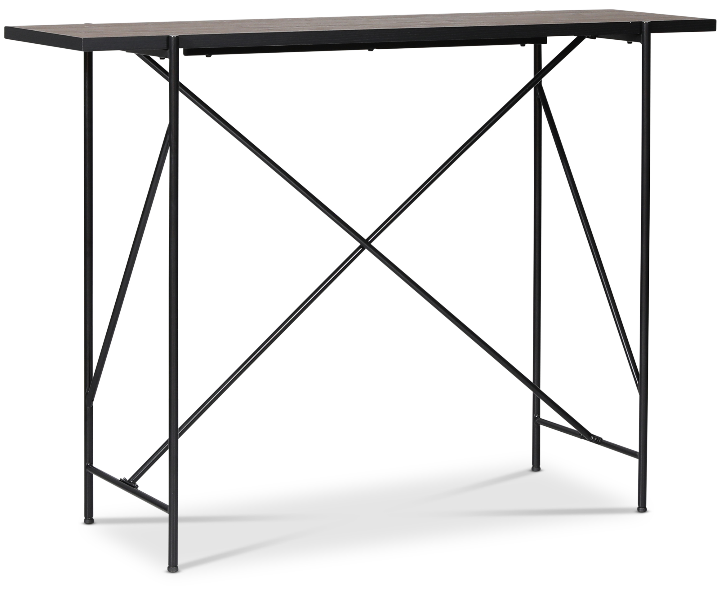 Barbord med 25 mm topplate av MDF med mønster av brunt tre. Svart stamme av metall.