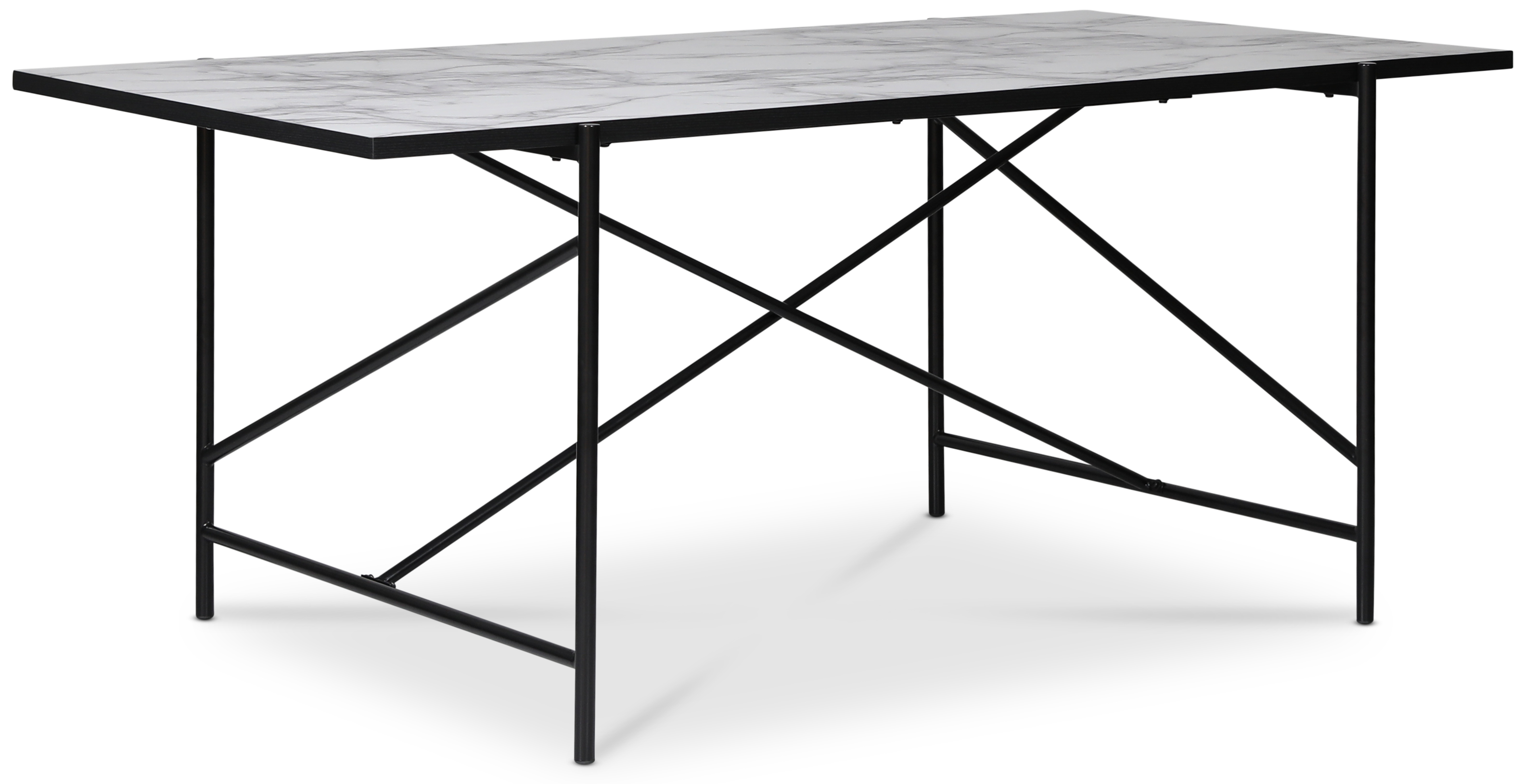 Spisebord med 25 mm topplate av MDF med mønster av marmor. Svart stamme av metall.