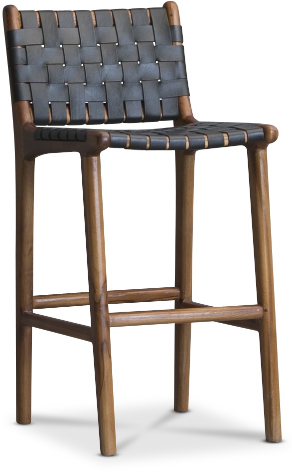 Retro barstol med seter og rygg i sadelgjord av svart skinn. Massiv trestamme i teak. Barstolen tilhører vår populære serie Porto.
