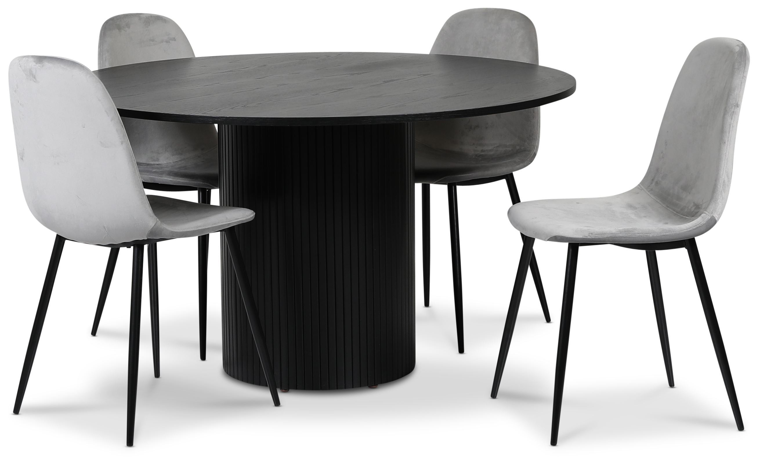 Moderne spisegruppe, Pose spisegruppe med svartbeiset topplate i eikefiner, stamme av massivt svartbeiset tre. Matchende Carisma stoler i myk grå fløyel med svarte metallben.