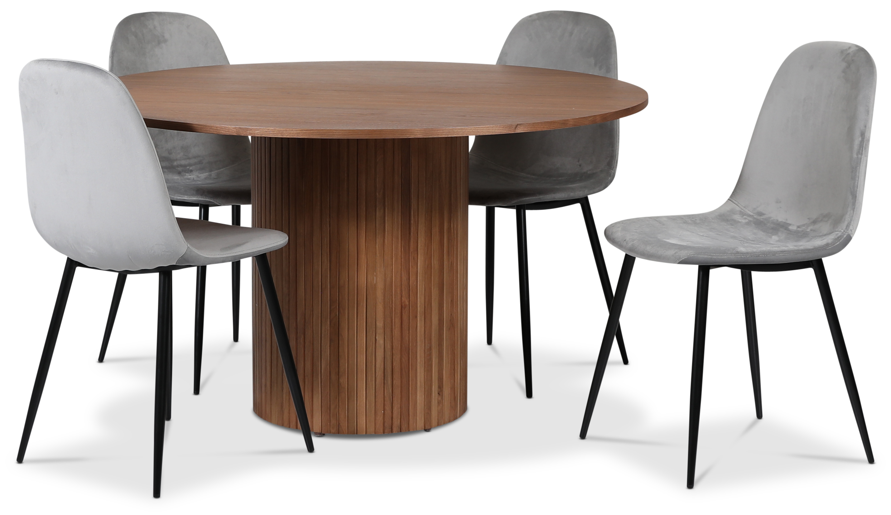 Moderne spisegruppe, Pose spisegruppe med valnøttsfinert topplate, stamme av massivt valnøttbeiset tre. Matchende Carisma stoler i myk grå fløyel med svarte metallben.