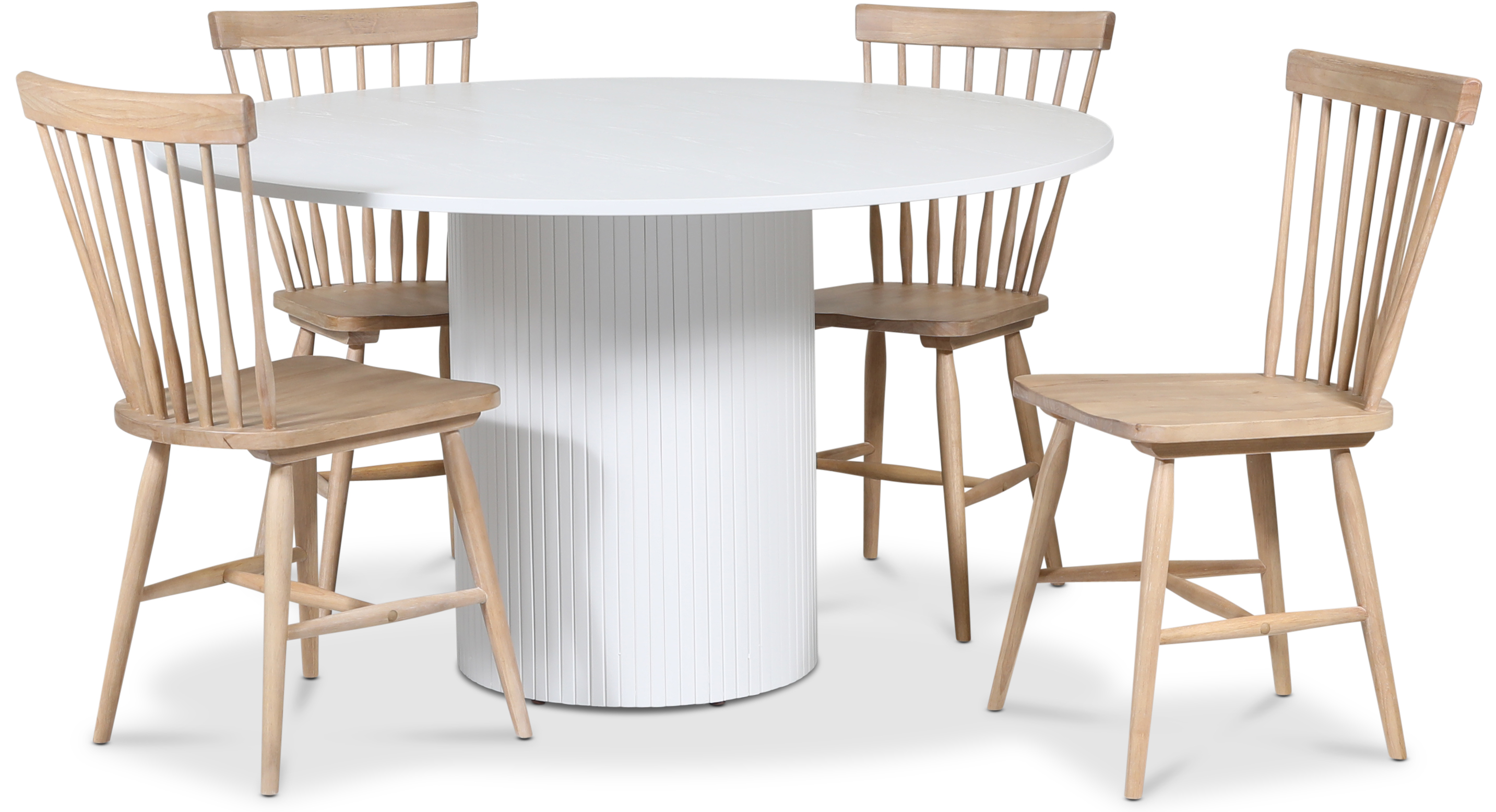 Pose spisegruppe: Bord Ø130 cm inkludert 4 stk pinnestoler - Hvitbeiset eik