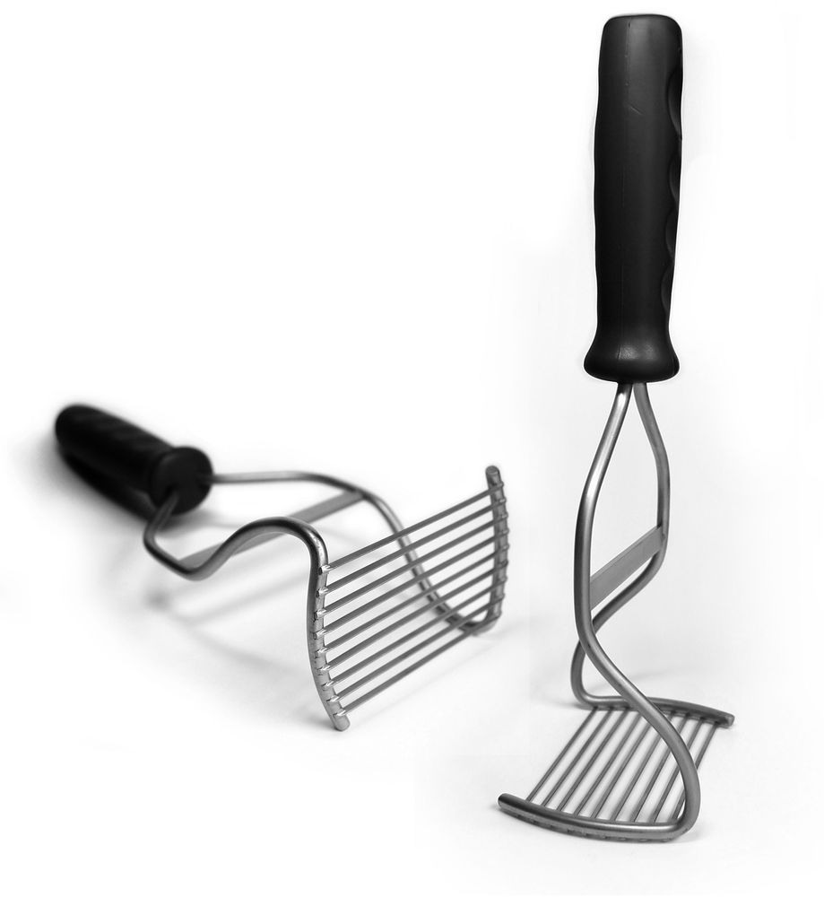 Potetmoser i 13/0 stål med svart håndtak av ABS/TPE (plast).