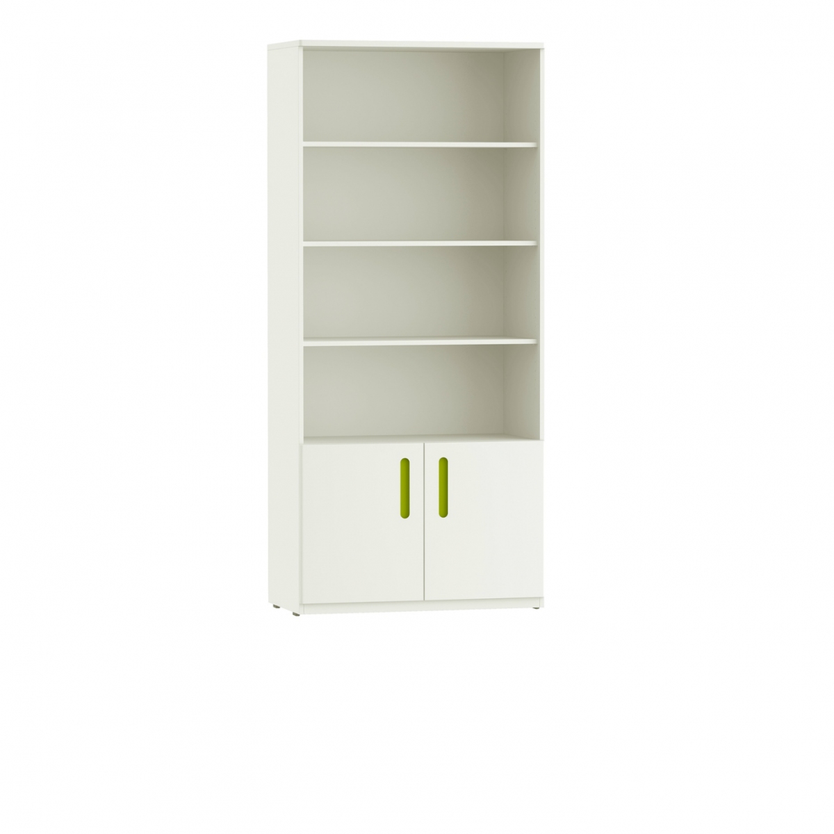 Romslig og praktisk bokhylle med god plass til oppbevaring, både med hyller og to dører nederst. Beslag for dører med funksjon som gir lydløs og myk lukking. Håndtakene finnes i grå, rosa, grønn, oransje og blå.