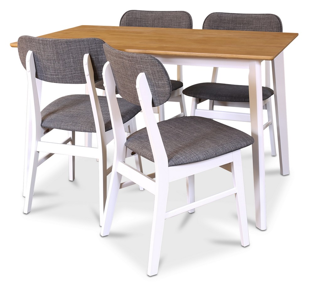 Pent bord fra Skånska Möbelhuset med hvit understell og eikebordplate. Stolene har hvit ramme og er kledd i grått stoff. Både bord og stoler er laget av massivt hevea-tre. En moderne spisegruppe som passer inn i de fleste hjem.