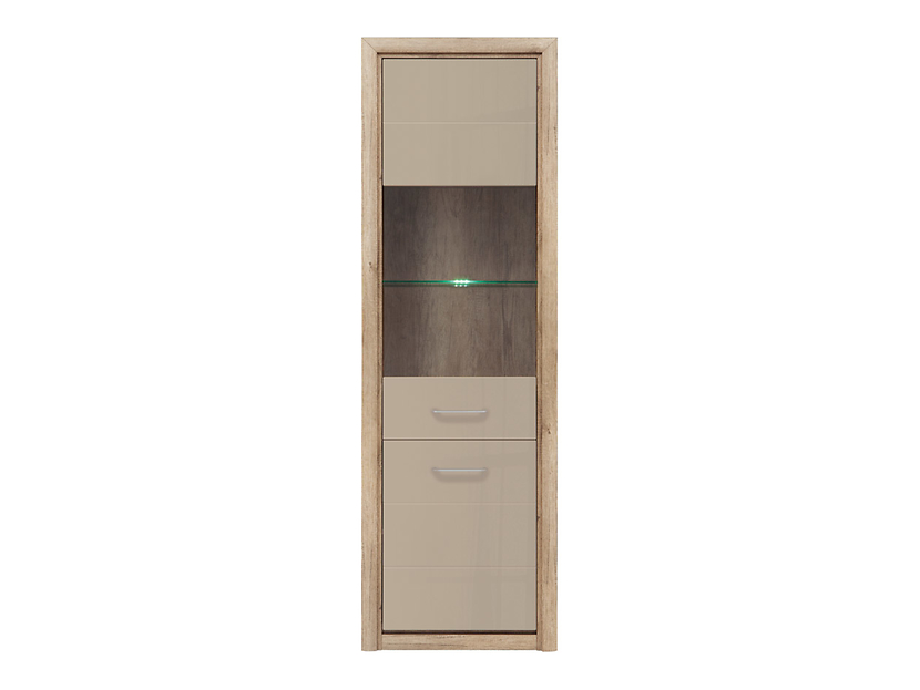 Et lekkert vitrineskap i ekimitaion med beige fronter. Skapet er funksjonelt da det er mulig å både vise og skjule tingene dine da det kun er glass på en del av døren. Vitrineskapet er innredet med flere hyller, noe som gjør det enkelt å holde orden på varene dine.