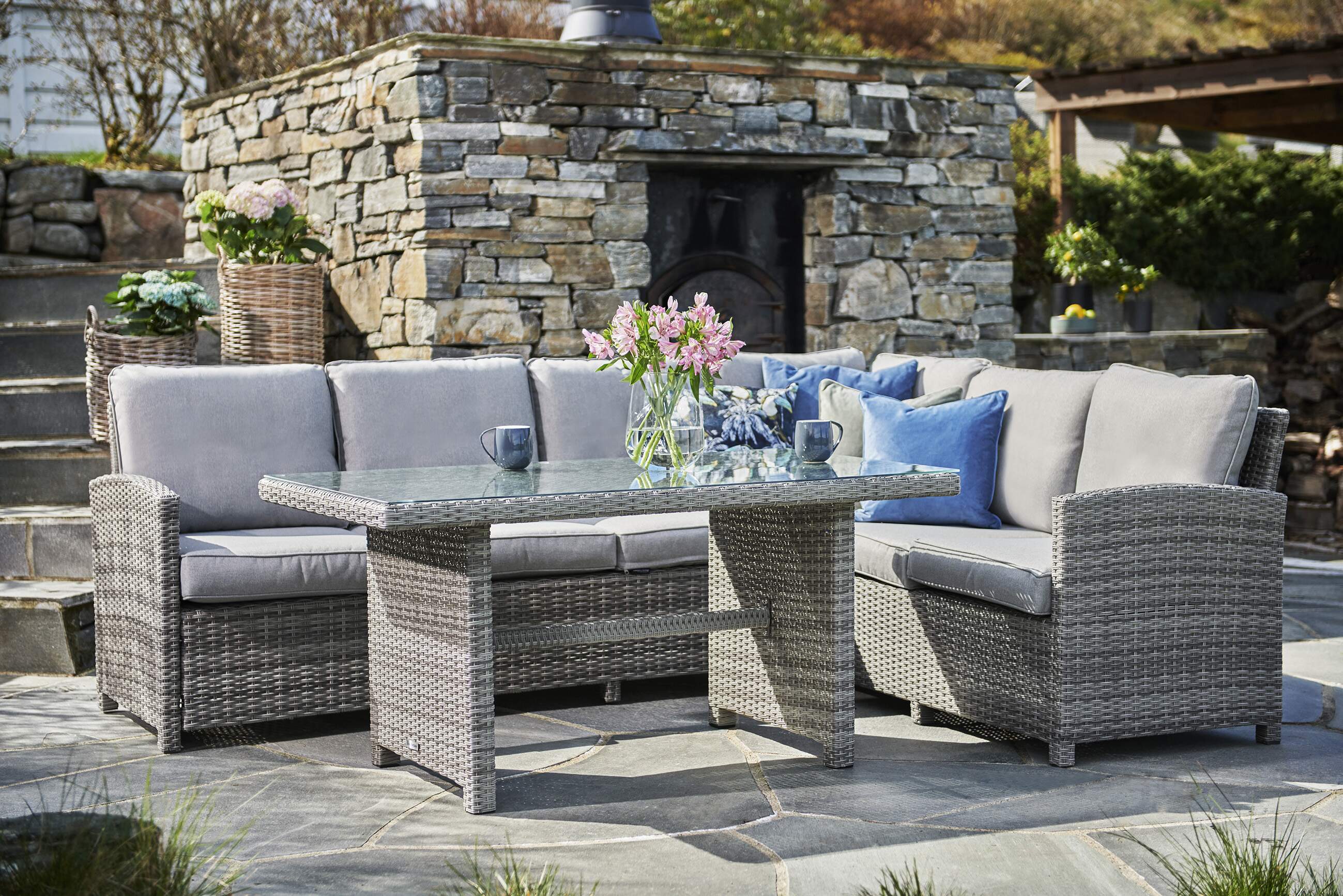 En mysig sofagruppe med en modern design. Laget i metall og kunstrotting, den 3x3 seters sofaen passer perfekt til uteplassen sammen med det fine bordet med en glassplate.