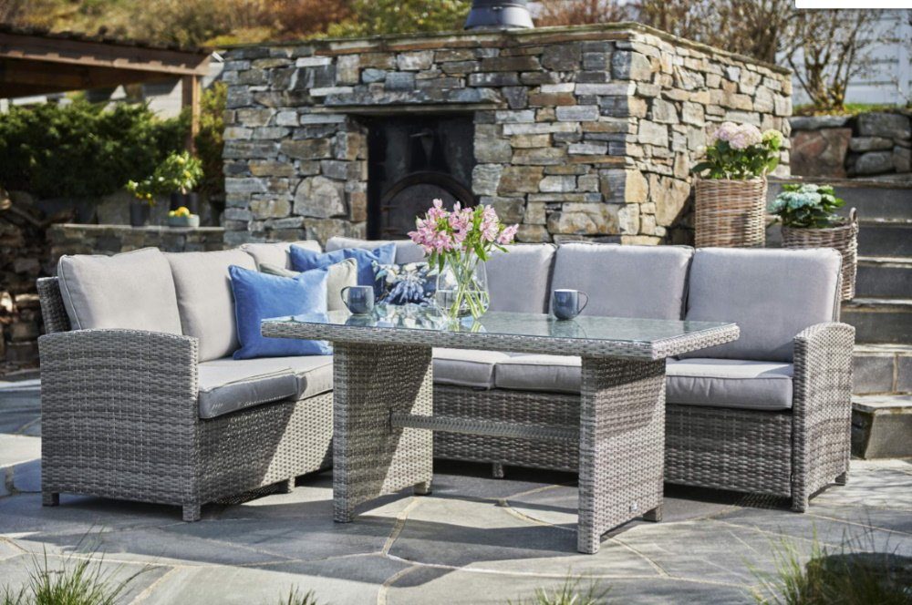 En mysig sofagruppe med en modern design. Laget i metall og kunstrotting, den 3x3 seters sofaen passer perfekt til uteplassen sammen med det fine bordet med en glassplate.