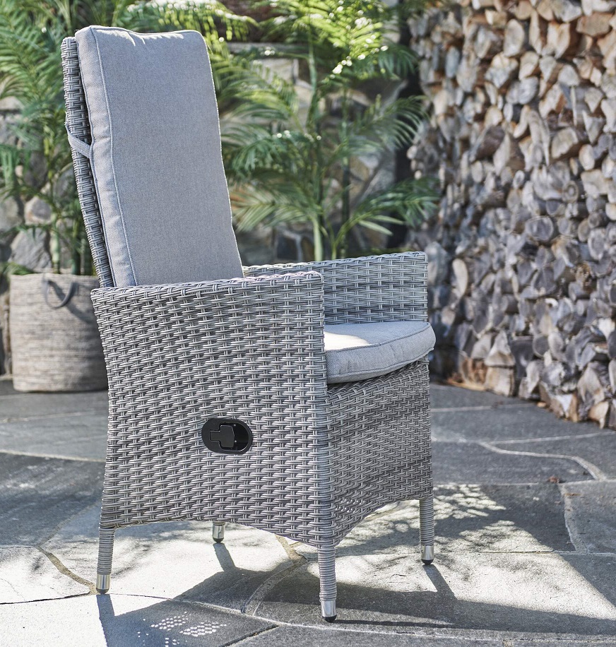 En fin utestol med et moderne design. Stolen er laget av metall og kunstig rotting med en lysegrå nyanse. Stolen passer perfekt til uteplassen, både alene for å sole seg på, eller i en gruppe ved et pent bord for de koselige grillkveldene.